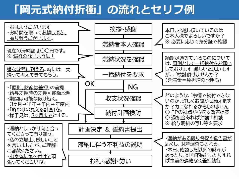 私は、この古来の手法を参考にして「岡元式納付折衝」という一つの型をつくりました。なお、「納付折衝」とは徴収職員の「早期に完納してほしい」という要望と、滞納者側の「すぐには納付できない」という正反対の意向に折り合いをつける交渉のことを言います。「岡元式納付折衝」では、滞納者とのファーストコンタクトから最後に見送るまで、以下の流れに沿って対応を進めます。
