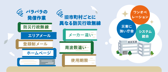 平成17年に合併をしたが、防災行政無線は旧市町村が個々のものを構築しており、メーカー・周波数が全て異なっていた。統合はしたものの、使い勝手が悪い状態だった。