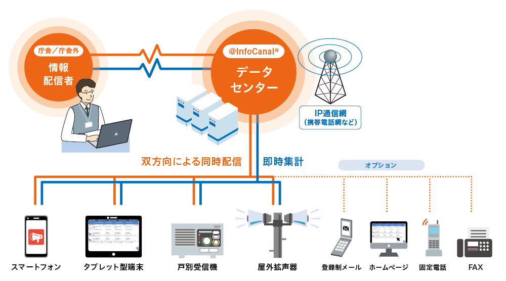 全国を幅広くカバーするIP通信網を使い、多種・大量の端末にワンオペレーションで配信。音声読み上げとテキスト配信に対応しているので、住民側の選択肢が広い。大規模工事や電波の申請などの手続きが不要のため、低コスト・短期間での導入が可能だ。