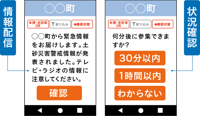 また、“双方向”通信が大きなポイントでもあり、情報が届いたかどうかを、住民は確認ボタンで回答することができる。回答状況は管理画面の地図上に表示され、職員は状況を見ながら再配信や次の対策を検討可能だ。