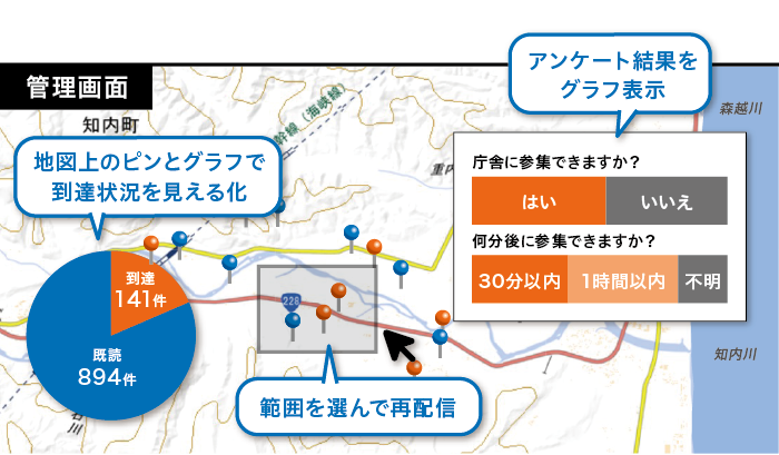 職員が使う管理画面では、未達や既読など住民側の受信状態がリアルタイムに地図表示される。アンケートの回答もグラフで表示され、状況把握や判断に役立てられる。