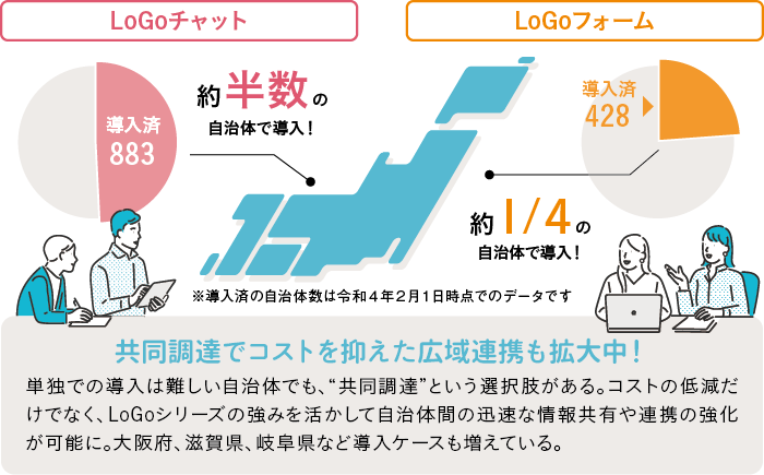 「ツールを通じて自治体同士がつながれると、先進事例を取り入れることが可能です。また、自治体がもつ課題は共通しているので、そこで出てきた解決方法も共有することができ、業務効率化が加速します」と木澤さん。この言葉を裏づけるのが、同社が手掛ける自治体専用ツール、LoGoチャットとLoGoフォームだ。