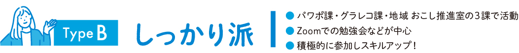 私は、中小企業支援を担当しています。コロナ禍で業務が増え、研修などが減ったこともあり、情報交換やスキルアップを目的にパワポ課やグラレコ課に加わりました。Zoomを用いた講演会やワークショップ式の勉強会で得た知識は、事業者向けチラシづくりなどの実務に直結。役所の書類は文字を詰め込みがちですが、それだと多忙な事業者は読んでくれません。すると電話での問い合わせが増え、結局、職員が対応に追われることに。ですが、ここで得た学びをもとにチラシづくりを工夫したら、電話の数が減り、残業時間も削減!“伝わる表現”の大切さを実感したし、今後は動画にも挑戦したいと考えています。オンライン市役所は“公務員の四次元ポケット”。いつでも力になってくれるので、困ったときも安心です。