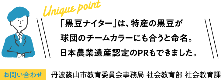 令和3年7月、千葉ロッテマリーンズの本拠地で「日本農業遺産認定記念 丹波篠山市 黒豆ナイター」が開催された。チーム本拠地以外の自治体名を冠した試合は珍しく、「選手の出身自治体とスポンサーシップ協定を結んだ例は、これまでプロ野球界ではなかったと思います」と担当者。