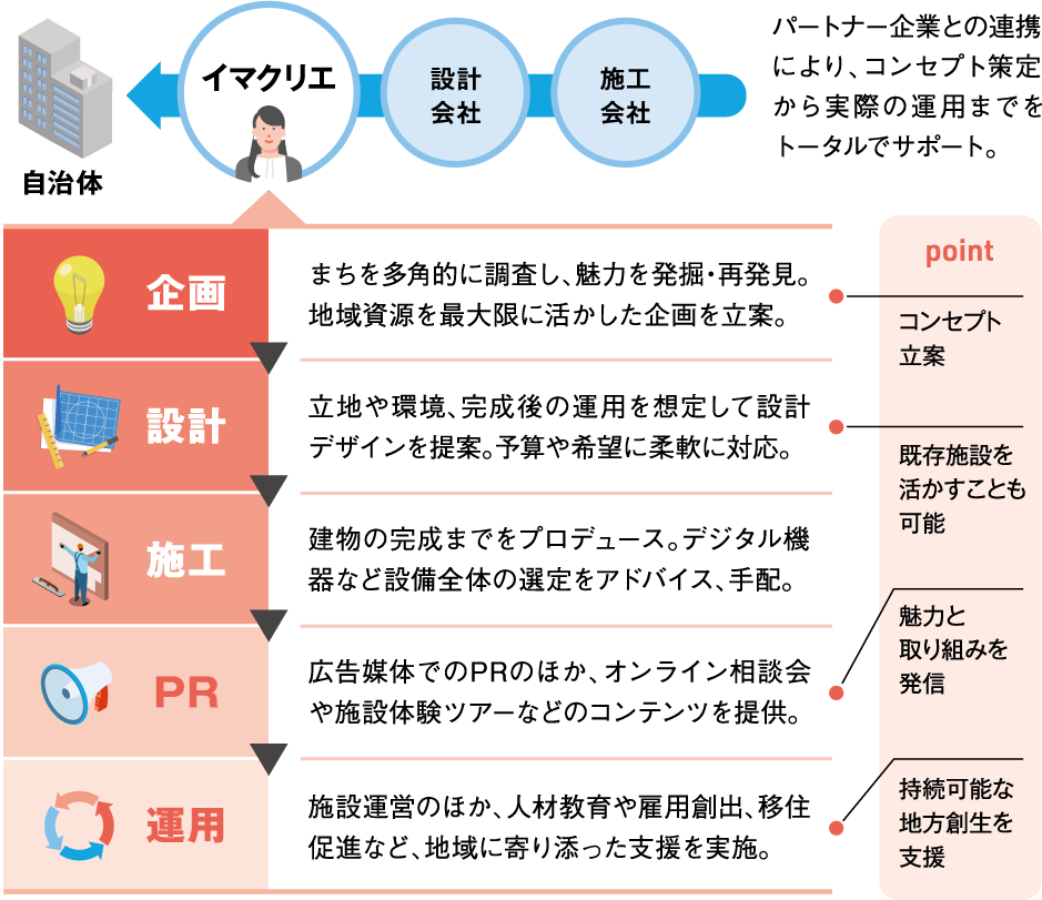 町の目指すビジョン策定を支援。説得力のあるブランディングを立案し、進出企業のハブとなるサテライトオフィスのプロモーションを展開。
