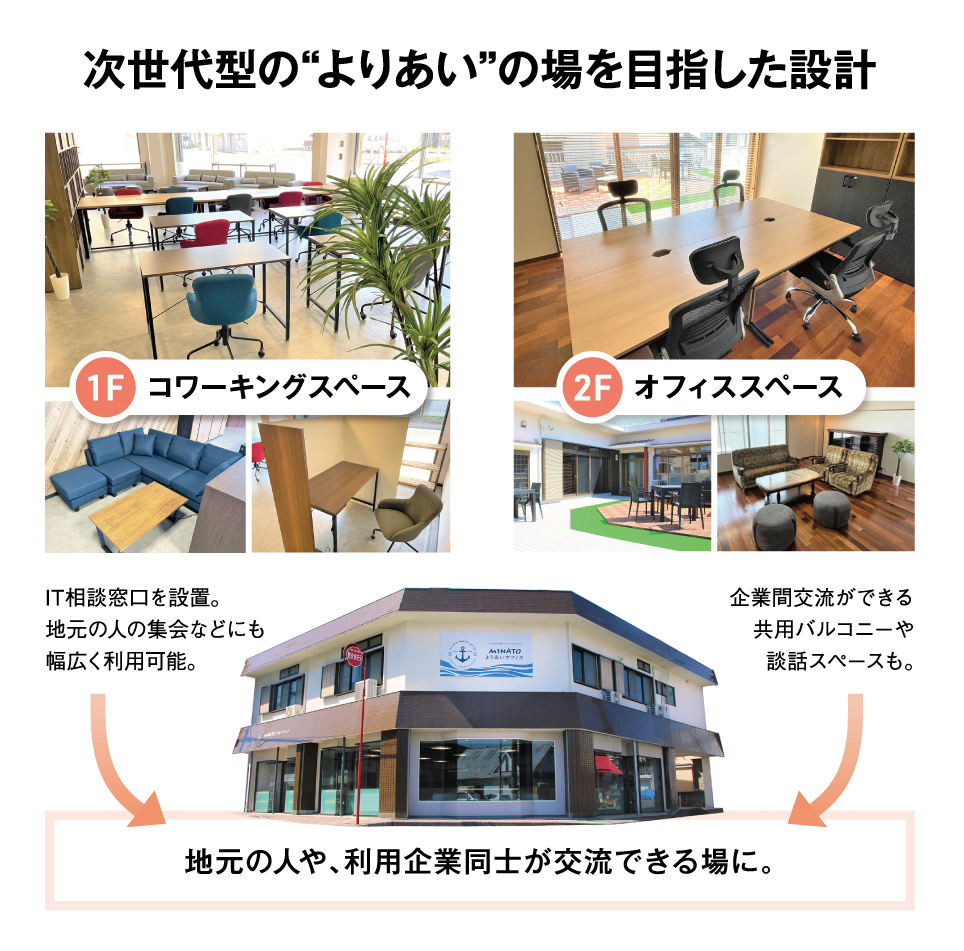 イマクリエは、サテライトオフィス整備運用や企業誘致、雇用創出事業など、地方創生につながる様々な支援を手がける企業だ。パートナーの「東京ガスコミュニケーションズ」はブランディングや空間デザインなどトータルプロモーションを担当し、施工は隣接市の建設業者である「宇都組」が受けもった。築40年以上になる施設の改修だったため、防水工事など想定外の課題も散見されたが、3社の連携によって迅速に解決。1階にコワーキングスペース、2階にオフィススペースを備えた「MINATOよりあいオフィス」は、令和4年5月にオープンした。