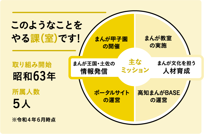 平成22年度には「まんが・コンテンツ課」が、平成29年度には「まんが王国土佐推進課」が設置され、現在は文化・国際交流の振興を担う「文化国際課」の「まんが王国土佐室」として取り組んでいます。