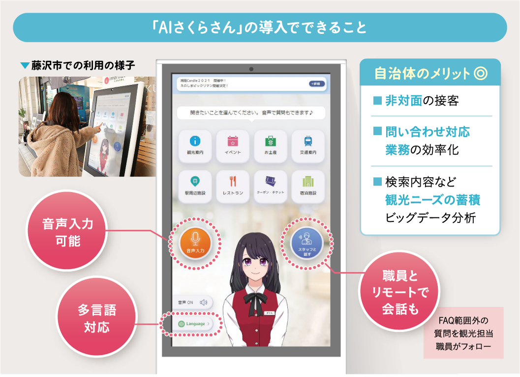 同システムは、案内所入口に設置したサイネージにタッチしたり、話しかけたりすると、画面内のAIアバターが職員に代わって質問に回答してくれるもの。リモート通話機能も搭載しており、AIで対応できない質問は遠隔地の職員が回答する仕組み。「操作が簡単で、システム管理画面にもさくらさんというキャラクターが登場するので、AIツールに不慣れな人も使いやすそうだと感じました。また、観光案内所での利用なので、人と人とのやりとりのような温かみを感じられることも導入の決め手になりました」。