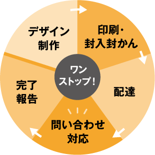 必要に応じて、媒体のデザイン起こしから印刷、封入封かん、配達、問い合わせ対応、完了報告までをワンストップで実施可能。別々に行っていた制作や印刷業務を取りまとめれば、業務効率化も期待できる。