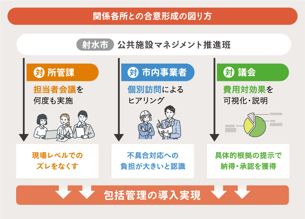 こうした経験の後、佐野さんは令和2年に行革推進班へ異動。施設マネジメントを手がけることになった。まずは、管財部門と協力して庁舎単体の包括委託に向け動き始めたが、それに対して市長から出た指示は“費用対効果の高い取り組みになるよう、庁舎以外の施設も含めて検討すること”というもの。この言葉に後押しされ、包括管理の導入に向けて歩みを進めたという。