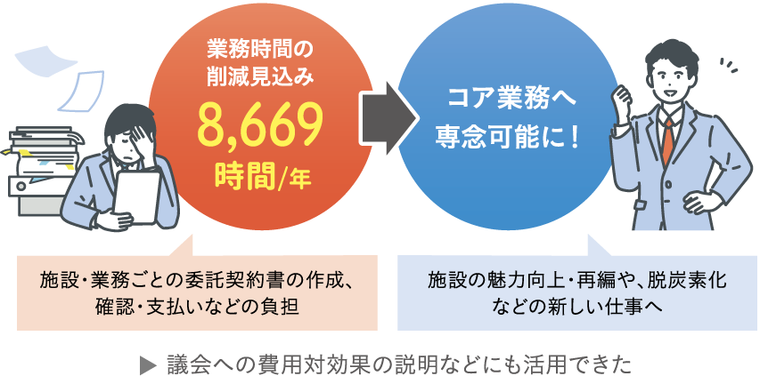 残された大きなハードルが“費用対効果”。ここでは人件費を可視化するという東京都東村山市の手法を参考にした。その結果、導入により削減可能な業務時間は、年間8,669時間と算出。この数字を根拠に議会へも説明し、プロポーザルにて委託先が「日本管財」に決定。“地域の未来を一緒に考える姿勢”がありがたかったという。