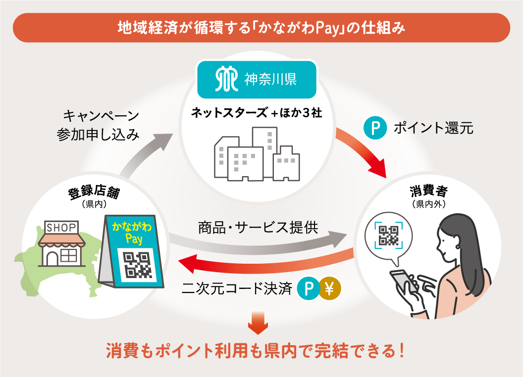 かながわPayは、同県が地元店舗の売り上げ増とキャッシュレス化の推進を目的に、令和3年10月から実施した「総額70億円還元キャンペーン」で使われたアプリ。加盟店は決済サービスに申し込み、1つの二次元コードを店頭に置くことで、一般的に普及している最大5つの決済サービスが利用可能になる。住民もアプリをインストールすれば、普段使っている決済サービスで参加でき、購入金額の10%または20%の「かながわポイント」と、各サービスのポイント※が還元される。
