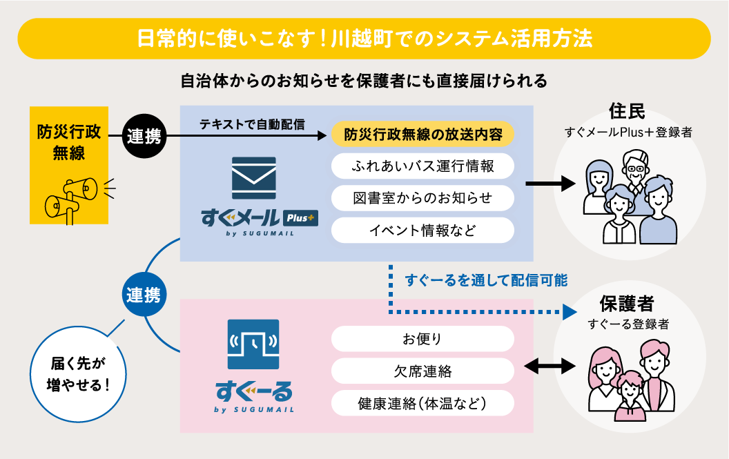 教育現場向けの双方向連絡システム、すぐーるにも情報配信が可能。入園・入学時に加入者が増えることで、自治体の情報をキャッチできる住民の数もコンスタントに増加していく。