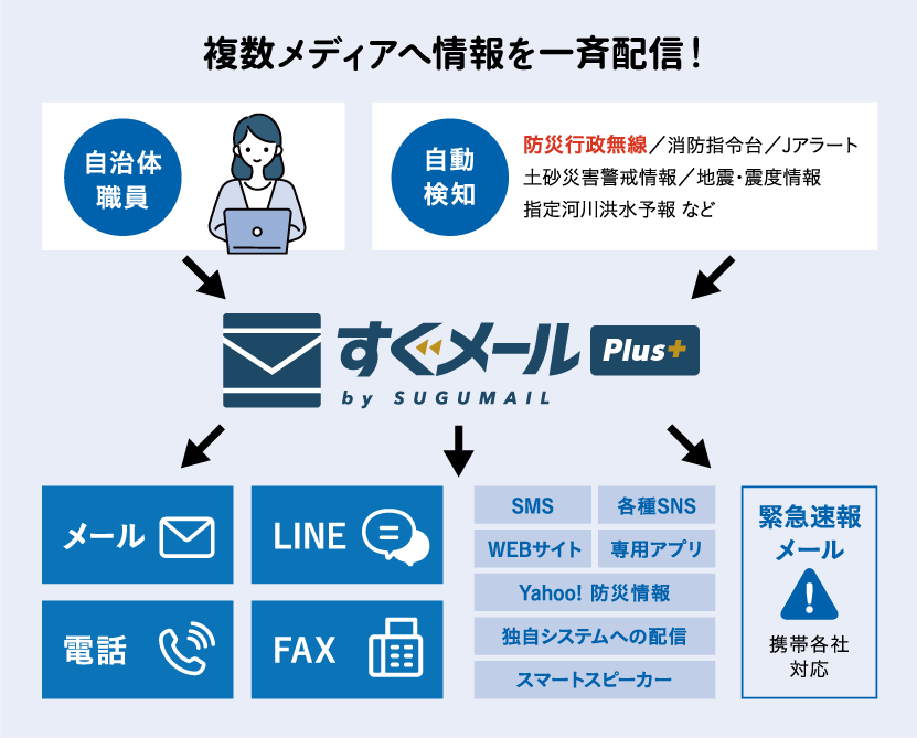 検討対象となったメール配信システムは、同社が提供する「すぐメールPlus+(プラス)」。これは従来版が進化したもので、メールだけではなくLINE・電話・ファックスなど複数メディアへの一斉配信や、他システムとの連携機能などが追加されている。職員のワンオペレーションで配信でき、気象情報や防災行政無線をキャッチして自動配信も可能だ。