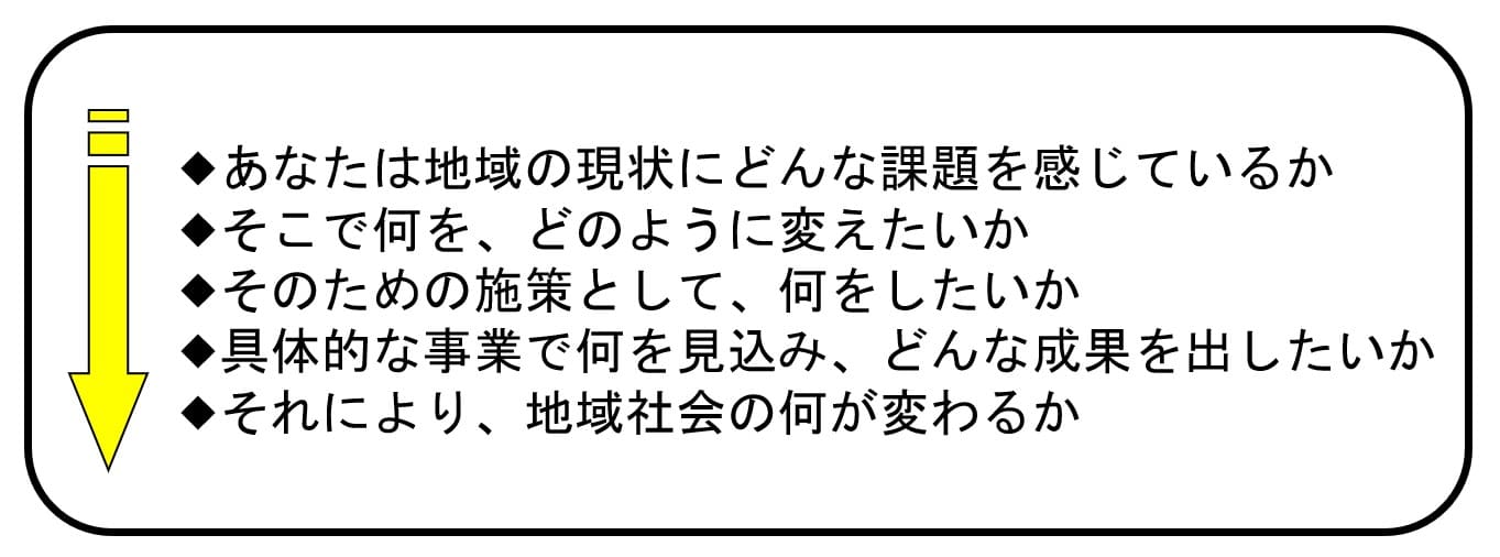 人々が求めているのは、あなたの施策ビジョンです。「まちをこうしたい!」というあなたの考えと、それを実現する具体的な施策を、上司や住民に一発で届くよう分かりやすく語って対話を仕掛けましょう。