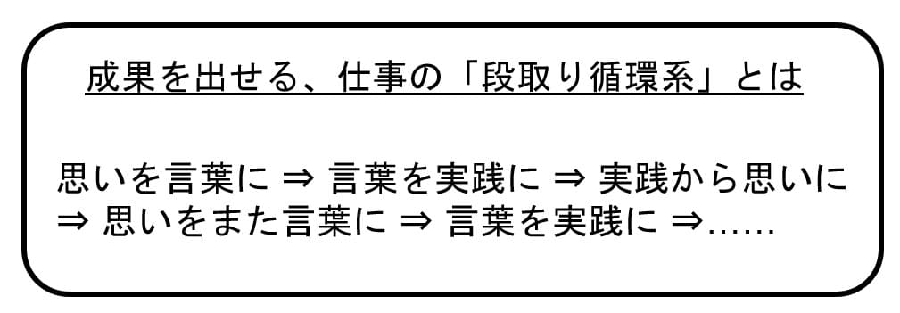 どの部署に行っても、思考⇒言葉⇒事業化⇒実行⇒思考⇒言葉⇒事業化…の循環系で行動すると、あなたの業務スピードは年々速くなります。