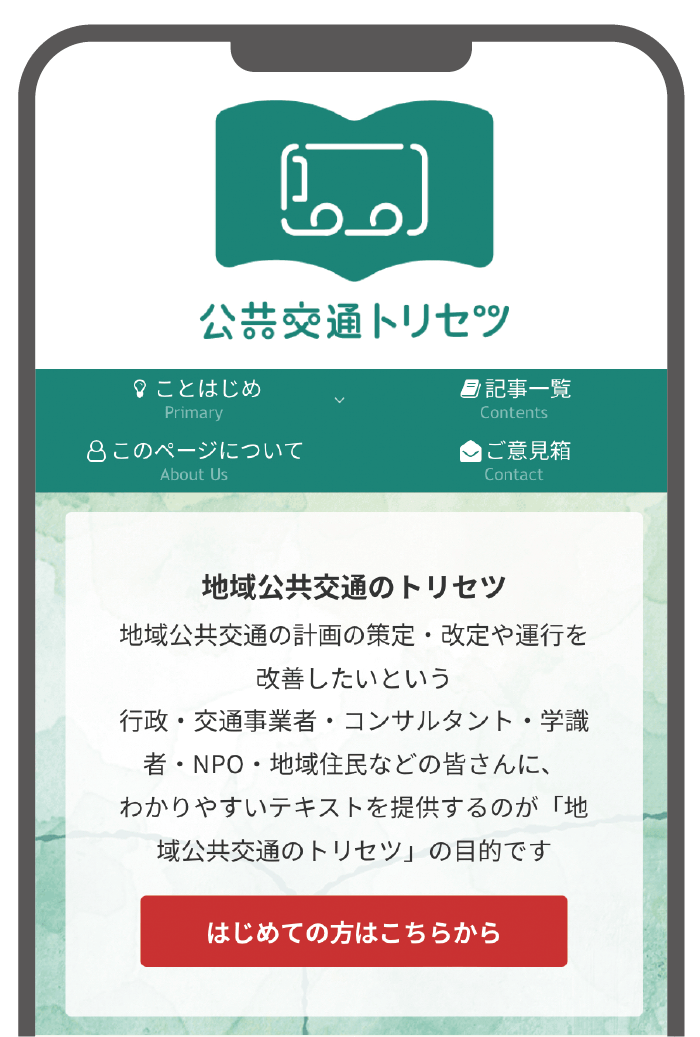学識経験者やコンサルタントなど、5人の専門家が令和2年に立ち上げたWEBサイト「公共交通トリセツ」。深い見識をもとに、“分かりにくい公共交通を分かりやすく”解説する。有識者として自治体事業に携わることも多い5人が記事を執筆し、月に3本ほど順番にアップ。そのためサイトには、現場の課題や問題点がタイムリーに反映される。