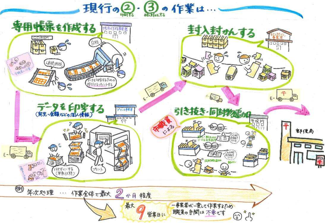 例えば、用紙と封筒の作成、在庫分の保管や数量管理、余剰分の産業廃棄物処理、差出不要分の引き抜き作業と引き抜き分のシュレッダー処理、郵便局への発送などから職員を開放します。