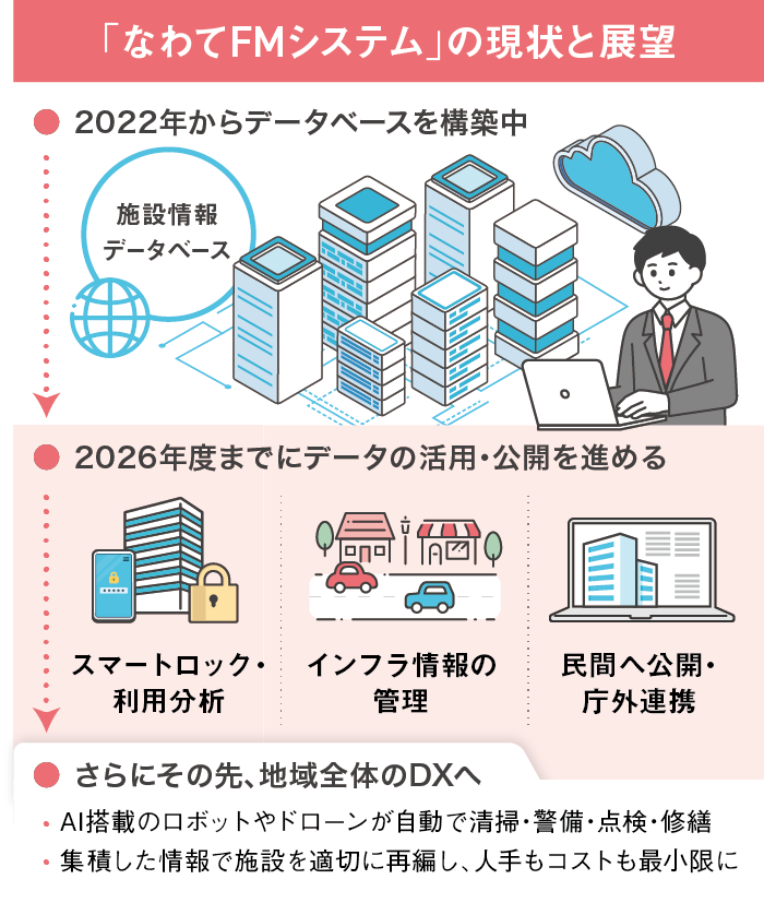 人口減少が進めば市の税収が減り、その結果、公共施設の運営が難しくなる。そうした未来を見据え、施設の再編を進めている同市。維持管理費や老朽化度合いなど、客観的なエビデンスをまとめるため、情報をクラウドで一元管理する「なわてFMシステム」の運用を始めた。「情報を集約すれば、限られた人員でも施設の管理が可能です。公共施設管理をデジタル化するという発想で、将来的には“場所を選ばない行政サービス”をかなえるための再編を目指しています」と話すのは、同システム運用を中心で担う桃井さん。