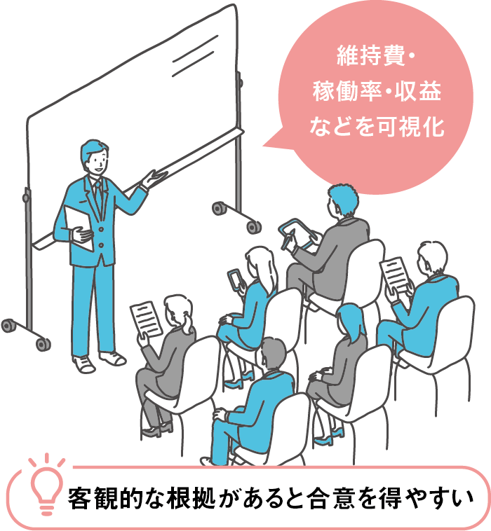 5カ年計画でシステムの形が整えば、ほぼリアルタイムの情報更新で、より正確な現状把握ができるようになるという。「稼働が多い施設と少ない施設を定量的に分析し、コストのかかり方を数値化します。例えば1㎡当たりのコスト比較で、“利用が少なく、コストがかかりすぎている”ことが明確に分かれば、集約化などを検討するきっかけになります。このように地域の皆さんに納得してもらい、スムーズに合意が得られることを期待しています」と古市さん。