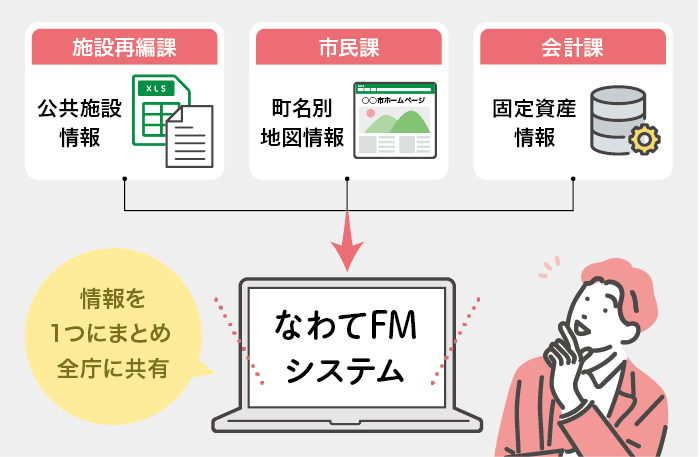令和3年8月、桃井さんが担当になった当時は、各施設の情報が、取り扱う部署ごとに管理されていたという。財産としての公共施設情報は施設再編課、町名別地図情報は市民課、固定資産としての情報は会計課が所有。管理方法はExcel、紙、システム、市のホームページで公開するなどバラバラだった。施設再編課の古市さんも「ある公共施設の情報を共有したときに、施設の管理課と当課でもっていたデータの相違が発覚することも。複数の部署にまたがる情報も、三位一体で取り出せることが理想でした」と話す。