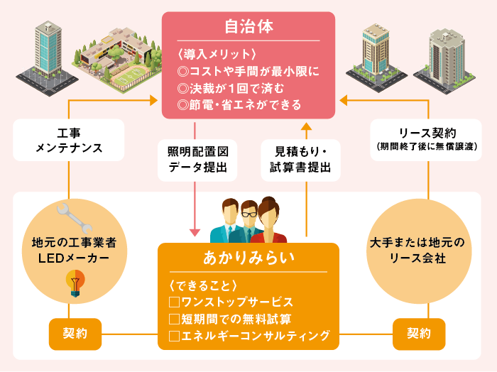 「当社はLED化を建設改修事業ではなく、省エネ策の行政改革として提案します。実務負担や費用を最小限に民活方式で導入し、その先に省エネや電気代の節約を実現しながら、浮いた財源を他事業にまわしていただく。その結果、明るく快適なまちづくりの実現を目指します」。目先の課題改善にとどまらず、長期に自治体の財政や事業を支援する。こうした持続的な対策が、これからの行政運営に求められるのではないだろうか。