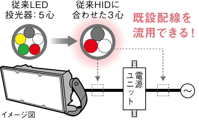 HIDと同等にまで軽量化し、既設架台への負担を軽減。電源ユニットと灯具の間の配線を3心にすることで、既設の配線を流用できる。