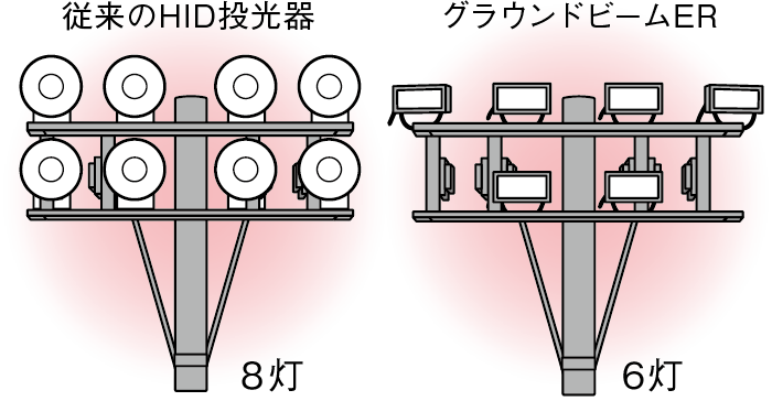 スポーツ照明事業に参入し、競技に適した照明や、周辺への光害に配慮した設計を手がける同社。新商品では“施工のしやすさ”にこだわり、中でもグラウンドビームERは軽さがポイントだという。HID照明とほぼ同じ重量に設計したことに加え、灯具と電源の間の配線を既設から流用できるようにしたことで、交換作業の負担軽減をねらっている。