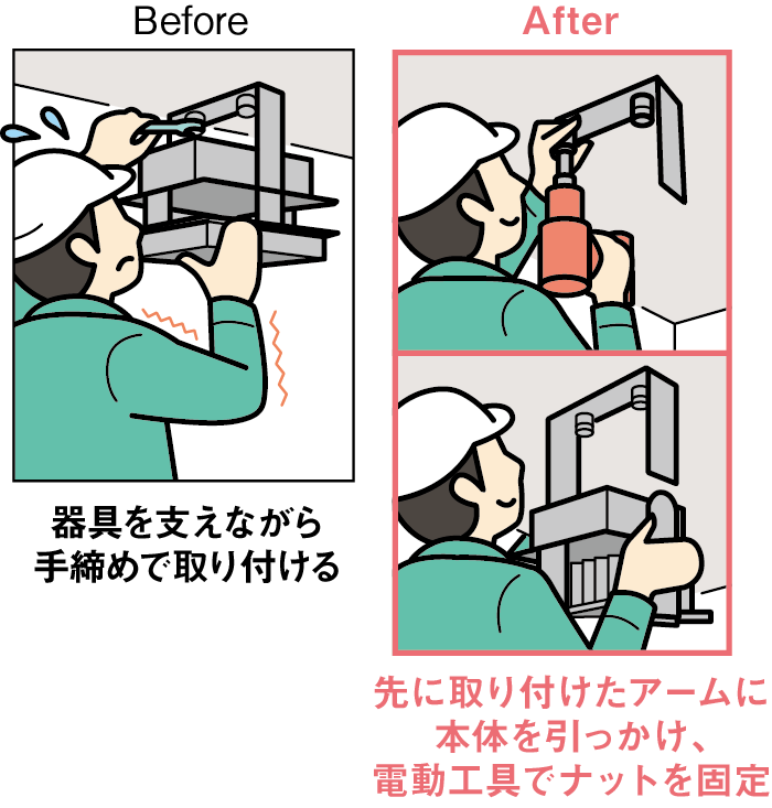 先に軽量のアームだけを取り付けることで、従来はできなかった電動工具での取り付けが可能。最後に本体を引っかけ、工具で締めるとスムーズに完成する。