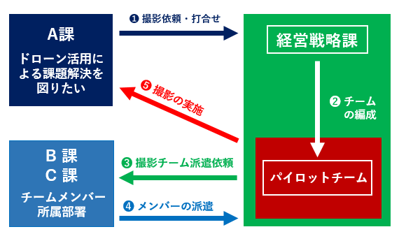 なお、庁内での利活用にあたっては、活用要望のある部局と経営戦略課が事前打ち合わせを行ったうえで、撮影内容や日程等を確認後、パイロットチームメンバーにその都度声かけを行い、原則として3人1組の撮影チームを組織し、所管の業務に支障のない範囲でメンバーが参加・撮影業務にあたっています。