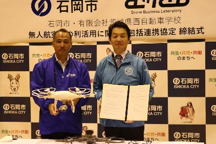 職員の派遣を契機に、受け入れ元である民間ドローンスクール「ドローンビジネスラボラトリーつくば校(茨城県下妻市。以下d-lab)」を運営する「茨城県西自動車学校」とドローンを通じた意見交換等が図られ、令和2年11月には「無人航空機の利活用に係る包括連携協定書」を締結しました。