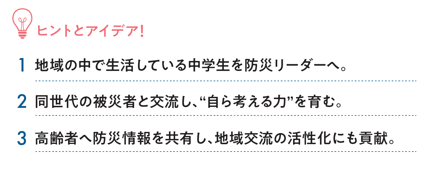 また、大嶋さんは今後の課題を次のように語る。「コロナの影響で、地域とのリアルな交流が3年間も途絶えてしまいました。中学生と高齢者の関係構築に関しては、振り出しに戻ったつもりで取り組みたいですね。また、幸いにも大きな災害があまりない中で、いかに緊迫感をもって継続的に、無理なく活動を続けていけるかも考えていかねばならないと思います」。さらに、「私は今年から防災部担当となりましたが、中学生を主軸に据えたこの取り組みがとても斬新に映っています。今後も様々な工夫を凝らしながら、続けていきたいですね」と村田さん。