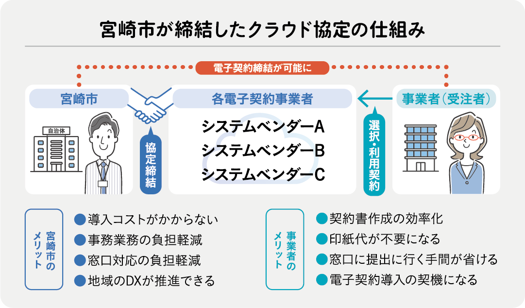 自治体側は複数の電子契約システムベンダーと協定を結ぶ。地域の事業者は、その中から任意のベンダーのシステムを活用。事業者から自治体に電子署名の依頼を行い、電子契約を締結する方法。