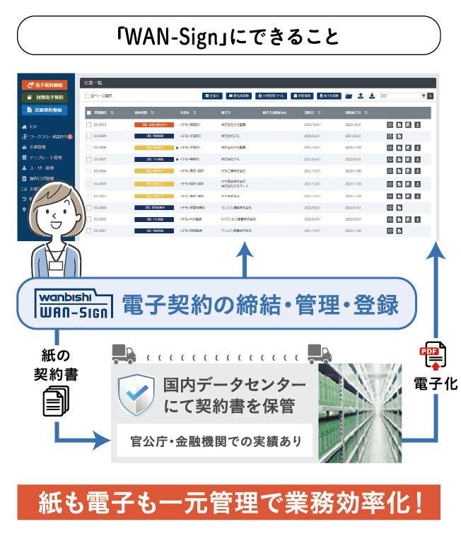 紙の契約書や台帳のスキャニング電子化サービスも実施している。そのため、電子契約書と紙の契約書が混在しても、契約書類全体をシステム内で一元管理できる。