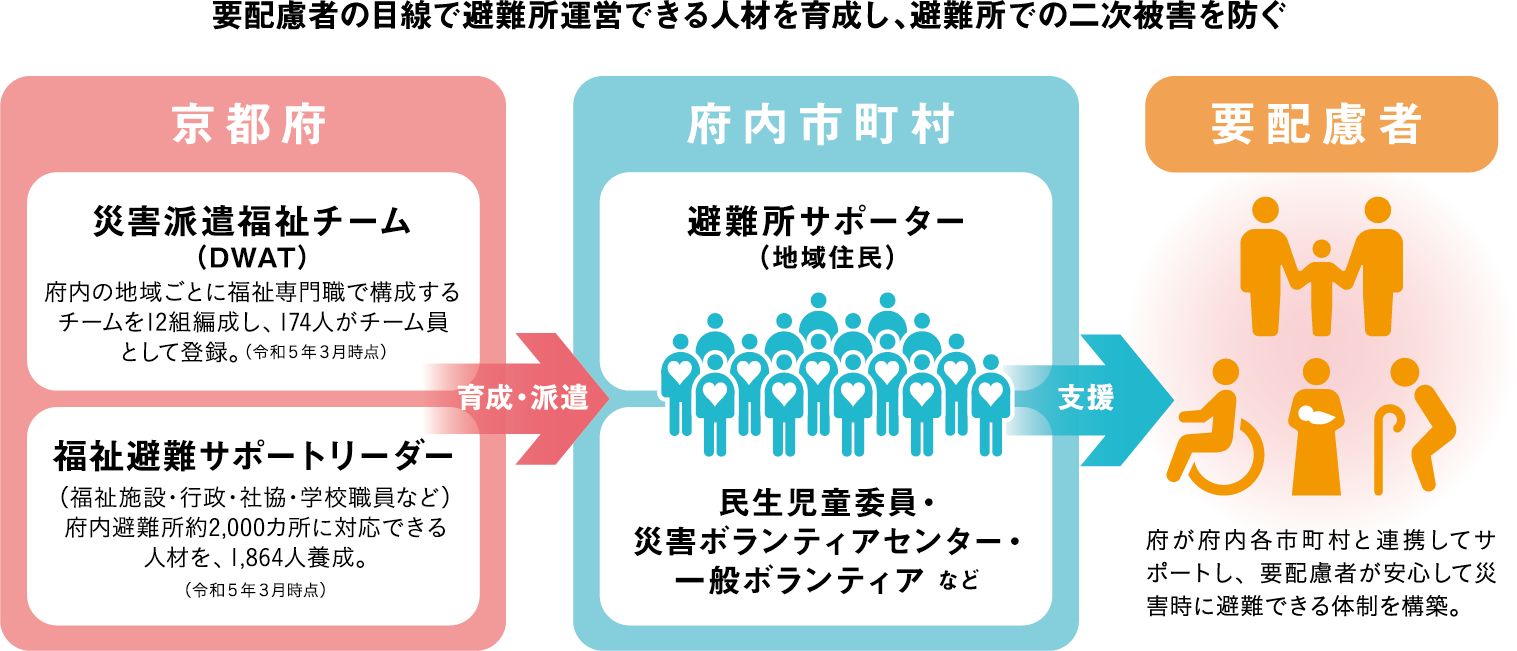 そのほかにも京都DWATは、上図のように各市町村とも連携し、避難所の設置・運営などを支援。府と市町村で重層的に支援できる体制を整えている。