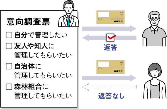森林整備を効率的に行うためには、放置された森林の所有者から管理を委託してもらう必要がある。点在した状態では管理コストが高くなるため、森林の集約化が欠かせないのだ。そこで同町では制度にもとづく意向調査票を所有者に郵送し、自分あるいは知人が管理するか、自治体や森林組合に委託したいかを調査。「意向調査票を送るだけでは、宛所不明で返ってきたり、返答がなかったりして回収率が低くなるのは明らかでした。