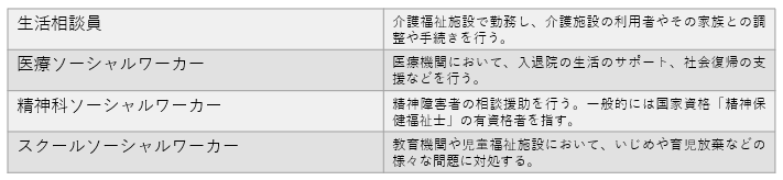 なお、生活保護関連ではないが、医療機関に勤務し、患者から医療や介護に関する相談、退院後の生活の不安や医療関連費用についての悩みの相談を受けるケースワーカーも存在する。