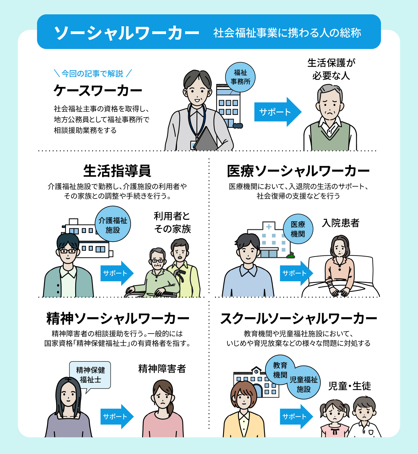 もともとアメリカで体系化された職業で、それが近代になり日本でも発展した。支援対象者は、高齢者や身体障害者、ひとり親家庭など様々。ここでは、生活保護受給者を支援するケースワーカーについて解説する。