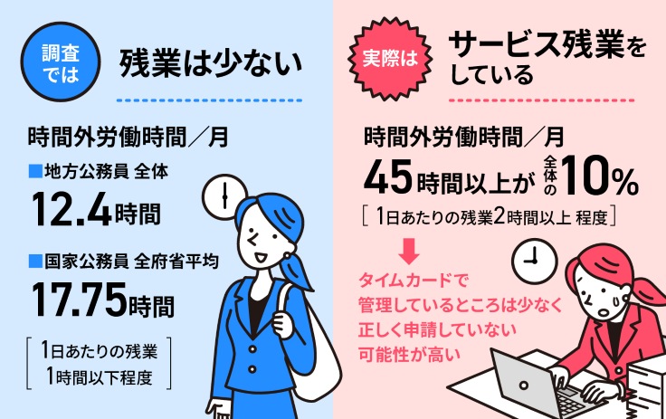 働き方改革の流れもあり、公務員の残業削減は課題となっている。統計上では地方公務員の残業時間は平均12.4時間となっている。国家公務員については、令和5年の平均年間超過勤務時間数は230時間となっており、月にすると約19時間となる(