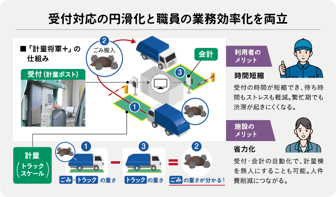同センターには、平成10年の開所当時から運用していた計量管理システムがあった。平成28年に更新したが、原因不明のエラーが度々発生し、搬入車両の対応に時間がかかっていたという。同センターは年間で6万t 以上のごみを焼却処理しており、ただでさえ利用者が多い。特に引っ越しシーズンや年末年始などの繁忙期は事業者のトラックと一般市民の車両が渋滞し、敷地外に行列があふれることもあったそうだ。