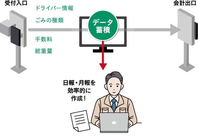 ごみを搬入した事業者や市民の情報はシステム内にデータで蓄積される。データはセンターから集計担当課に提出する月報の作成にひも付くため、出力や手入力が不要になり、業務が効率化される。