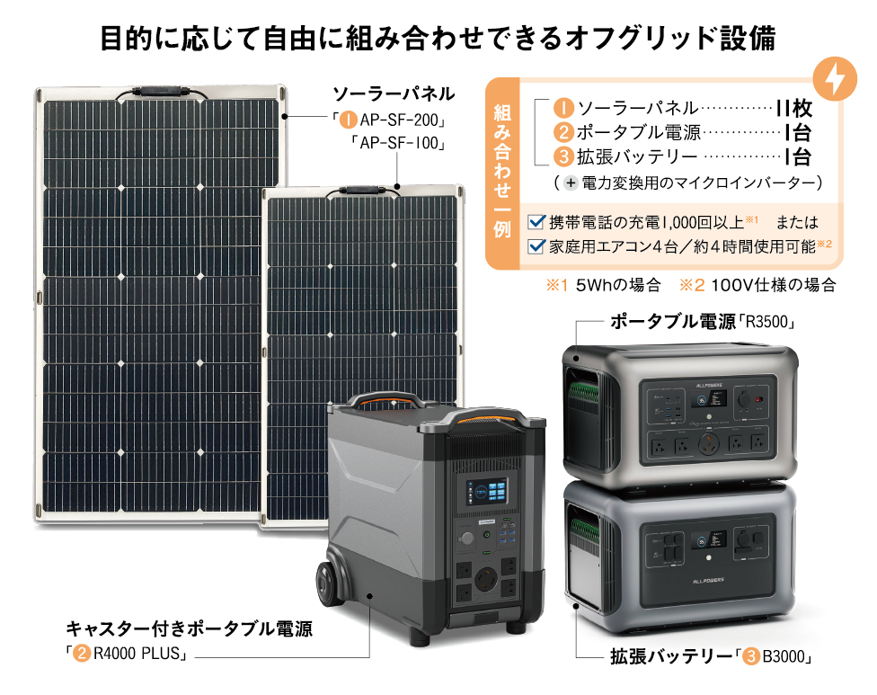 そこで、同社が提案しているのが、ソーラーパネルやポータブル電源などを組み合わせた設備だ。自社で開発から販売までを手がけ、製品展開が幅広く、課題や目的に応じた適切な提案ができるという。「一般的に、オフグリッドの設備一式を導入する場合、工事費用を含めて500万円ほどかかります。一方で当社の場合はポータブル電源や拡張バッテリーなどを組み合わせて(下部図示参照)、200万円前後で設置可能な上、複雑な工事も不要です。もちろん安定した電力を供給することができます」と崎村さん。