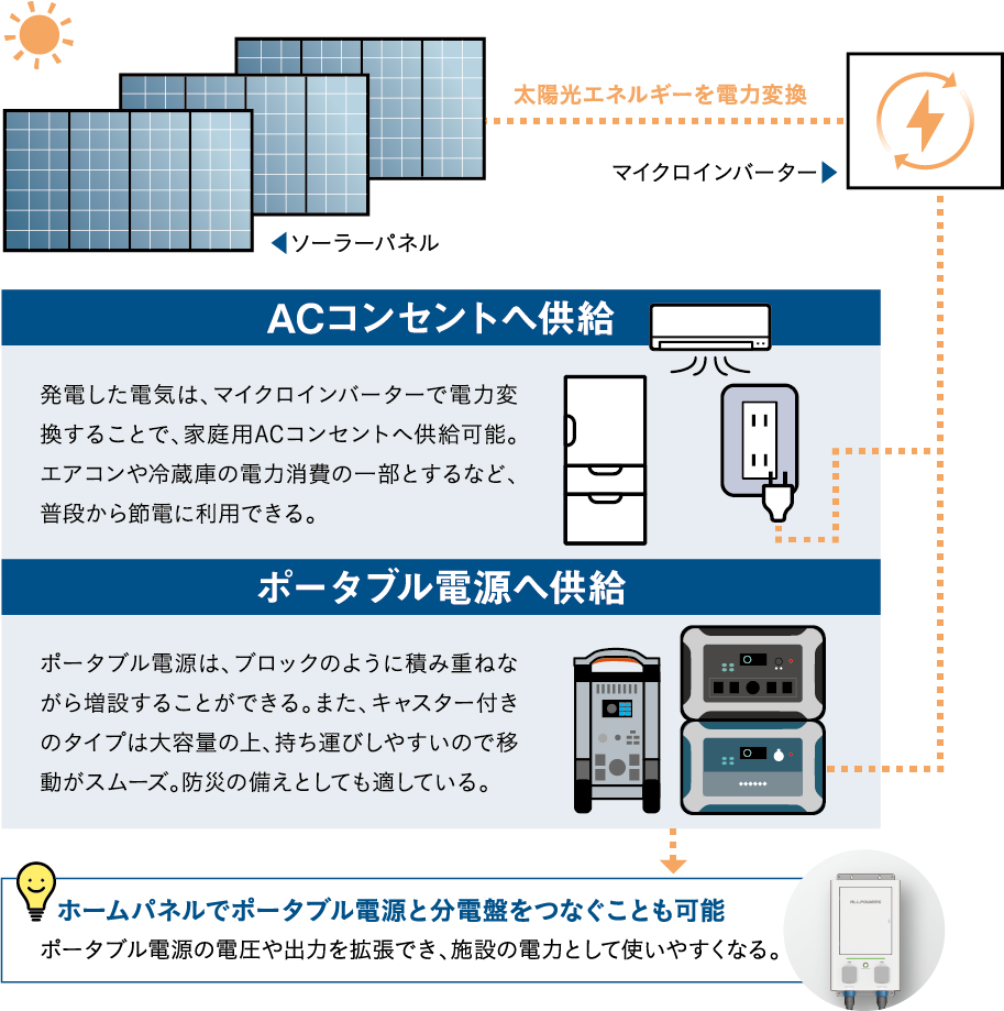 災害への備えは、いざというときに速やかに使えなければ意味がない。さらに、災害時には全庁を挙げての対応が迫られるため、防災担当の職員だけでなく誰でも簡単に使えることが重要だ。そこで同社は、平時からソーラーパネルで発電して、マイクロインバーターで電力を変換、家庭用ACコンセントやポータブル電源へ供給することを推奨しているという。蓄えた電気はパソコンや冷蔵庫などの電力消費の一部として使用できる。「普段から使用することで、節電対策として活用できるだけでなく、もしものときにも慌てることなくスムーズに使えます」。