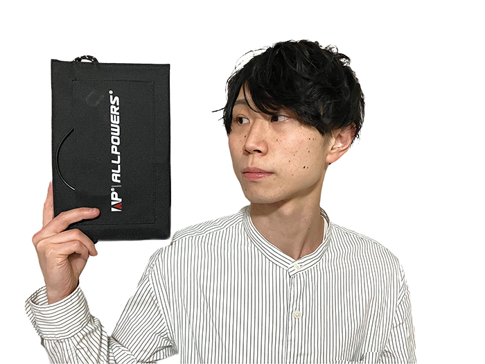 加えて、製品のラインアップが豊富で様々なニーズに応えられる点を強みとして挙げる。「例えば、避難所の空調や調理などで多くの電力を必要とする場合は、ポータブル電源や拡張バッテリーを並列することを提案します。また、スマートフォンの充電や電気毛布などに使える、個人向けの小さなソーラーパネルも人気です(写真参照)。複数備えておけば、必要な人が交代で使うこともできます」。