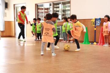 浦和レッズハートフルサッカー教室のコーチと一緒に、ボール遊びや試合を楽しむ子どもたち。
