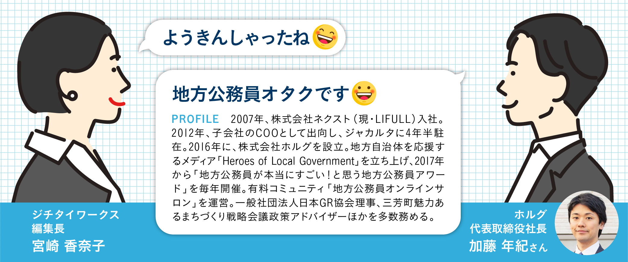 宮崎:加藤 年紀さん、不真面目のようで真面目な「とんこつ濃厚チャット」コーナーへようこそ!立ち上げ初回のゲストです!まずは、ホルグや加藤さんのことを知らない方に向けて、おさらい的な質問から。そもそも、自称・地方公務員オタクの加藤さんは、なぜ公務員を応援する仕事を始めたんですか?