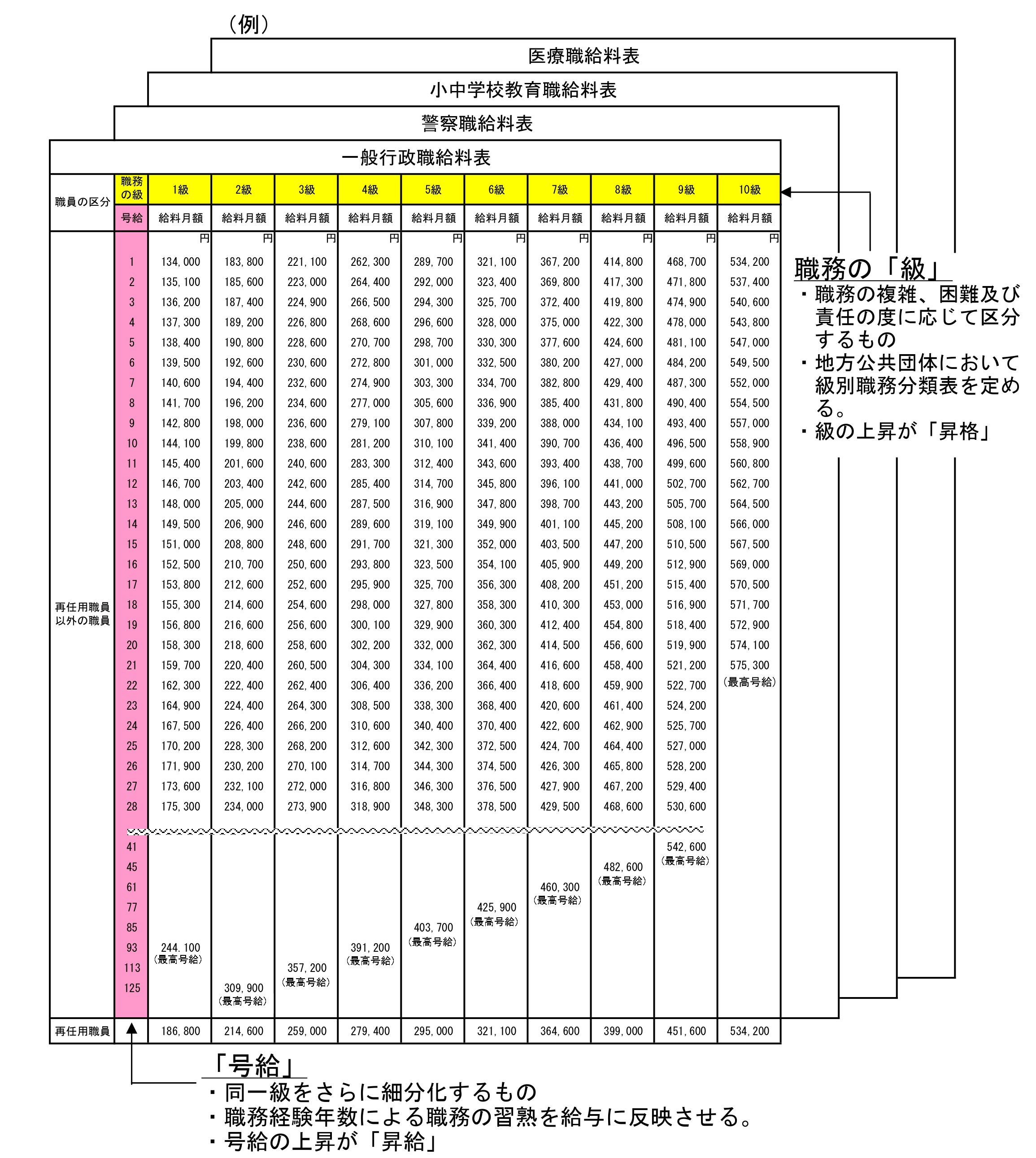 大谷 地方公務員の給料(基本給月額)は、給料表における「級」と「号給」の組み合わせで決まります。給料表は、各自治体が条例で定めています。
