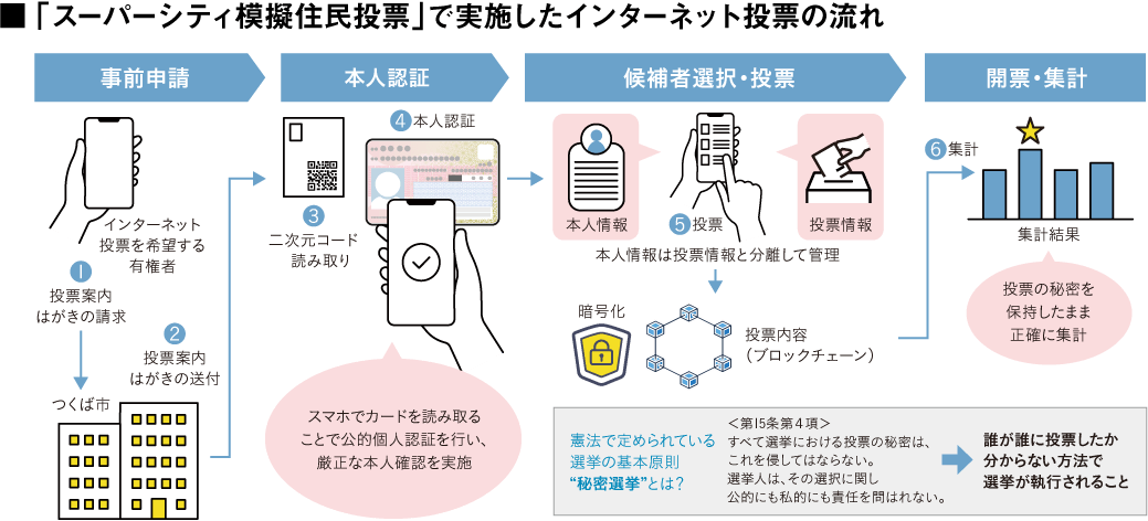 国が提唱する「Society 5.0」※1の実現に向け、平成29年度から「つくばSociety 5.0社会実装トライアル支援事業」を実施している同市。学者や研究員などの有識者からなる審査会において、事業選定にあたって住民投票を実施してはどうかという意見が上がった。そこで将来的な可能性も見据え、インターネットとマイナンバーカード(以下、カード)、ブロックチェーン技術を組み合わせた電子投票に挑むことになったという。
