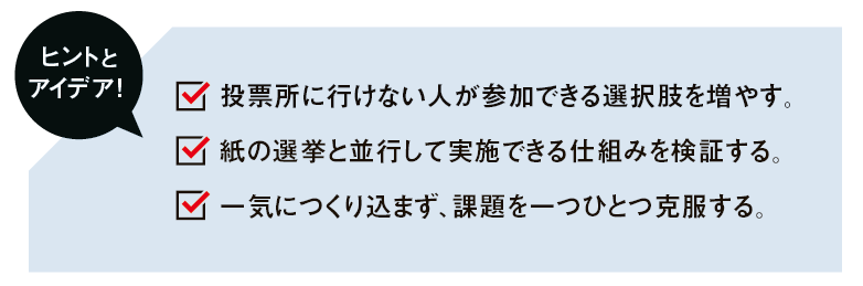 1人1票の原則「平等選挙」についても、インターネット投票希望者を事前登録制にすれば、選挙人名簿から登録者を事前に除外できるため、投票用紙との二重投票を回避できると考えられる。「投票所での投票との違いは、立会人がいないことだけです。この部分を国がどう考え、どのように対策するのかが、インターネット選挙の実現に向けた大きな壁として立ちはだかっています」。