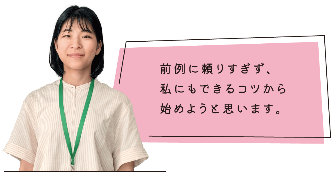 井上 私は新卒5年目で、業務に“前例”があると、つい頼りたくなってしまいます。しかも数年おきに異動があるので、新しい業務を覚えることに不安があって……。